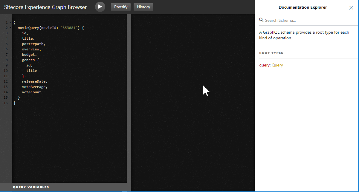 Now we have deployed our schema and configuration we now can test it. In the configuration I added the url /sitecore/api/graph/items/movies. Hiting the url will now result in the following error: {"errors":[{"message":"SSC API key is required. Pass with 'sc_apikey' query string or HTTP header."}]}. This is because my example forces you to provide the SCC API key. This can be done by adding ?sc_apikey={YOUR_API_KEY} in the querystring. Adding /ui will show the Sitecore Experience Graph Browser.