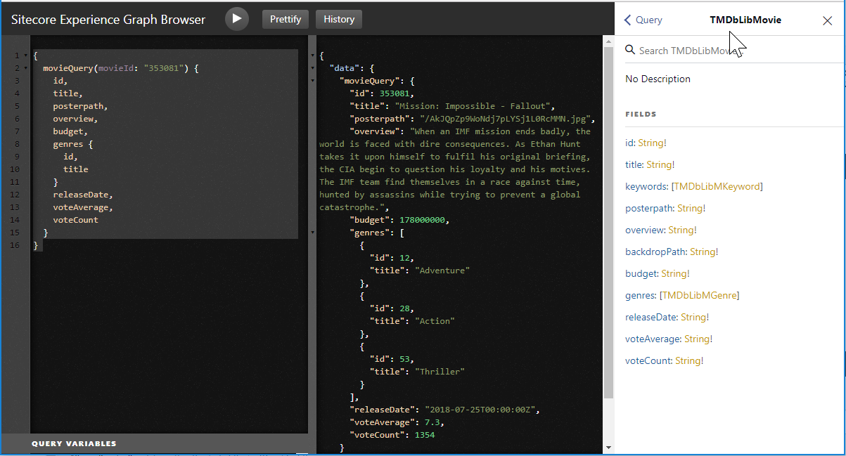 By default we will retrieve the field values as a string. In many cases we need to use other types like booleans, floats, lookups etc. For our demo I constructed two custom GraphTypes and constructed a ListGraphType from this. The result is that I now can also query the genres of the movie rather than getting an exception when querying the field.