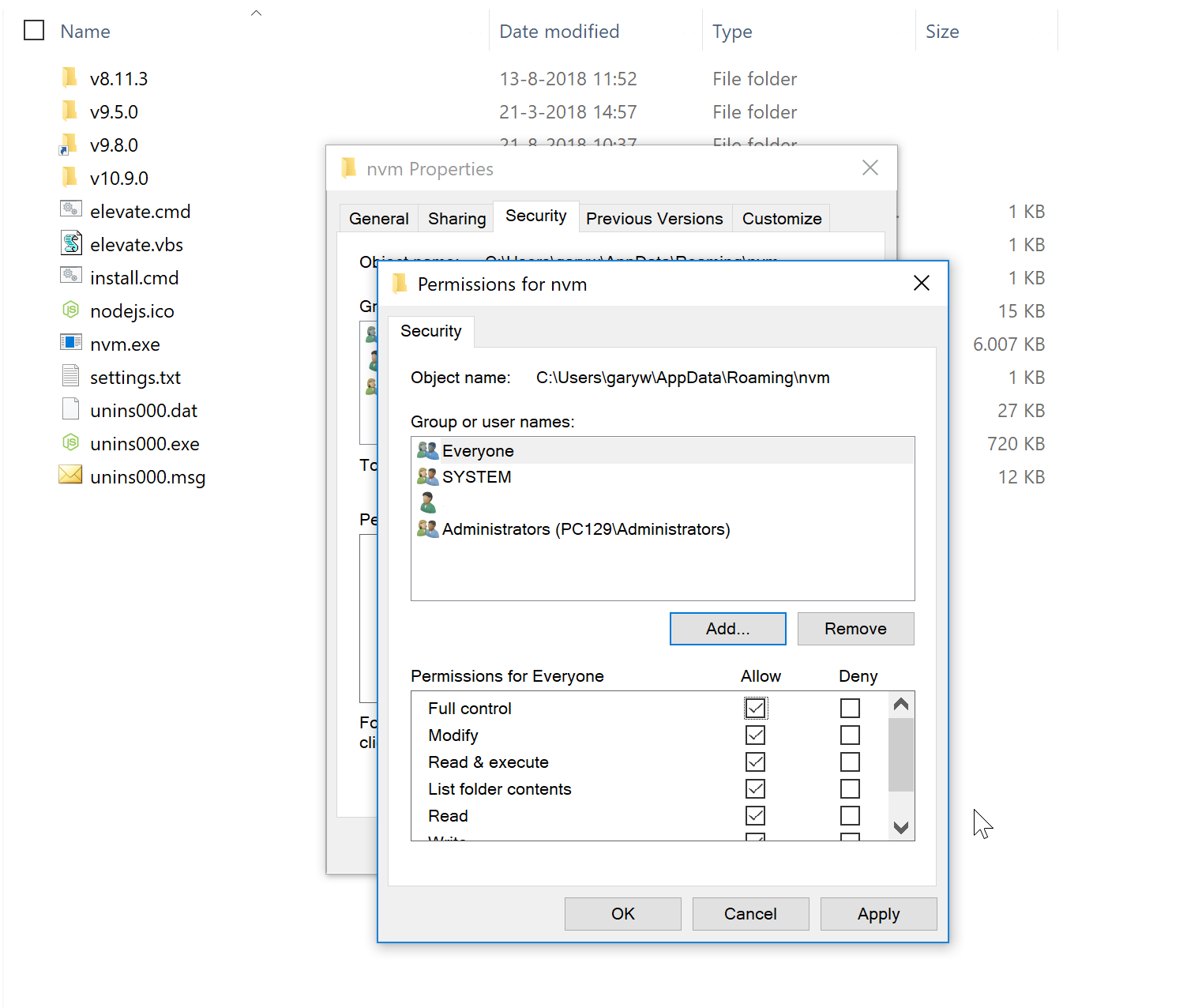 Adding everyone to the NVM folder will result in a working Experience Editor