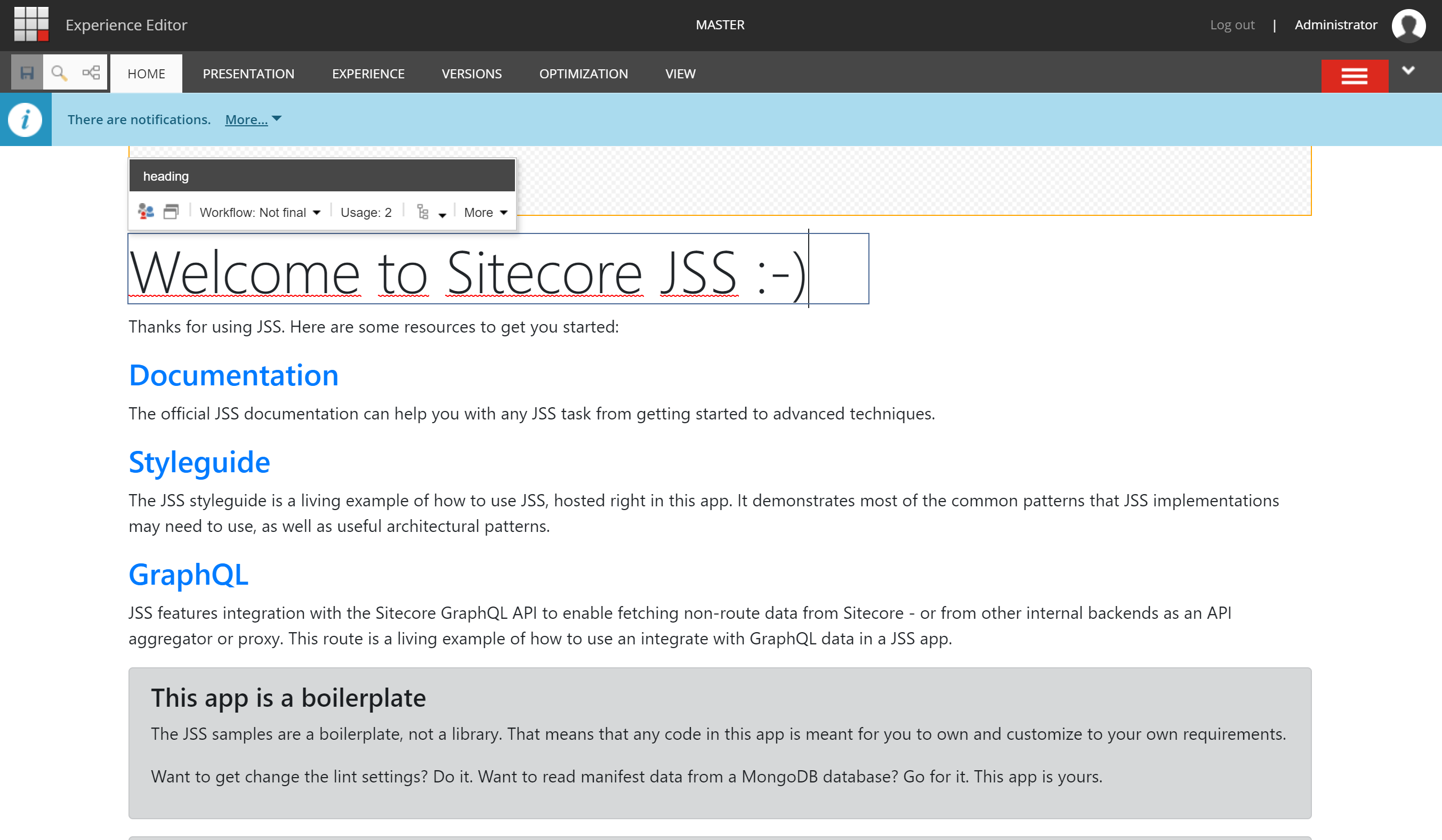 During my exploration of JSS I also wanted to deploy my app to Sitecore and check if I could open the Experience Editor and edit the fields. For this I used the command jss deploy app --includeContent --includeDictionary. After checking the Content Editor I actually had the node I expected: