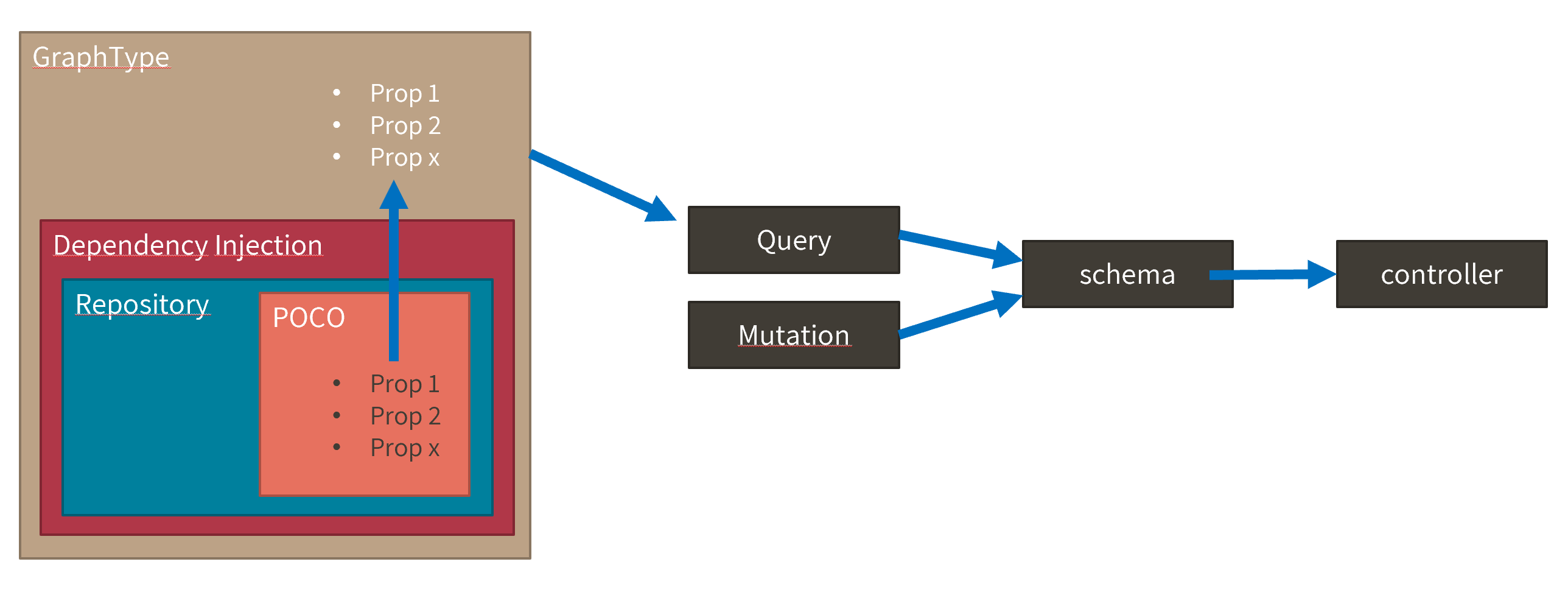 Using GraphQL.NET it’s very easy to implement your own schema. First Create a Repository that exposes your models. Then create GraphTypes. They will handle property mapping for your service. In the startup of your service all is registered so it will be available through dependency injection.